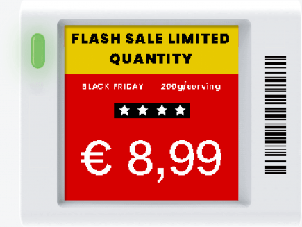 Elektroniczne etykiety cenowe wykorzystują technologię e-ink (papier elektroniczny), która zapewnia bardzo niskie zużycie energii i długą żywotność baterii.