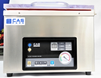 Pakowarki CAS CVP posiadają czytelny manometr zegarowy pozwalający na precyzyjne określenie momentu osiągnięcia wymaganego poziomu próżni w komorze pakowarki. Wbudowana funkcja automatycznego uruchomienia cyklu pakowania przez zamknięcie pokrywy komory pakowarki. Wytrzymała konstrukcja ze stali nierdzewnej. Ochrona przed przywieraniem folii przez pokrycie elementów grzejnych warstwą tkaniny teflonowej. Pakowarki CAS CVP posiadają najwyższą jakość wykonania i zgodność z obowiązującymi normami potwierdzona certyfikatem CE.